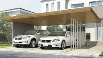 最もよく売れている車2台分を想定したカーポート。柱が左右に建ち、車を横に2台駐車できるタイプと、1台用を縦に連結して2台駐車できる縦連棟も選択可能。屋根形状もアールやフラットなどたくさんの種類から選ぶことができます。商品によって2台駐車できないサイズもあるのでご注意ください。