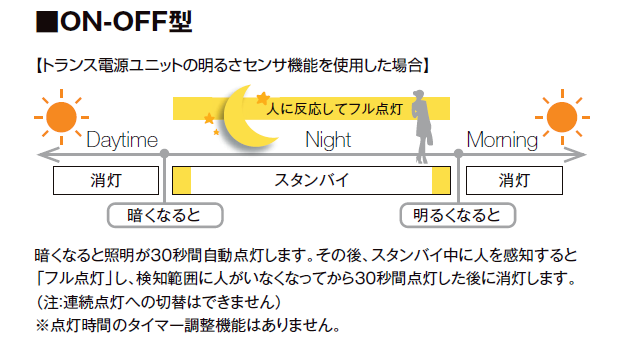 「ON-OFF型」は、真っ暗闇から急に100%で点灯するため、少し驚いてしまうことがあります。