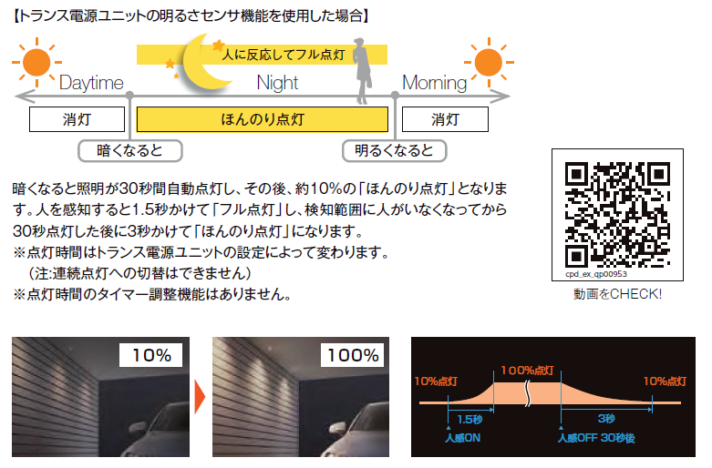 - 夜間の待機状態(人がいない時)「消灯(0%)」ではありません。「ほんのり10%点灯」で、常夜灯としてうっすらと点き続けます。