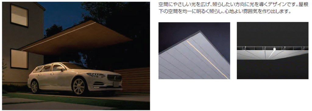 カーポートSCの天井に取り付ける照明には、大きく分けて3つの照明があります。「ダウンライト」、「シームレスラインライト」、そして新しい「ユニバーサルダウンライト」です。