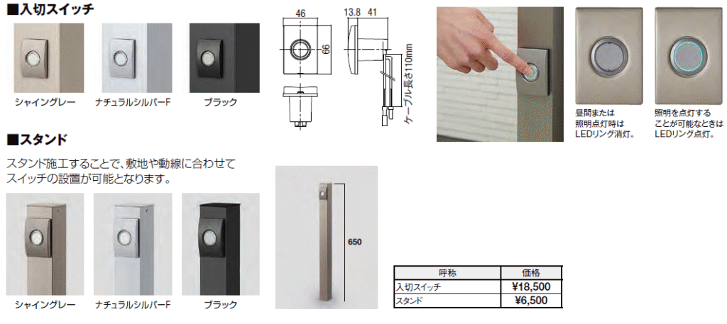 | 入切スイッチ | 手元のスイッチで好きな時にON/OFF | 消灯 | 部品代が高く、手動操作は不便。BBQなどで手動ONしたい特殊な方向け。 | 高 |