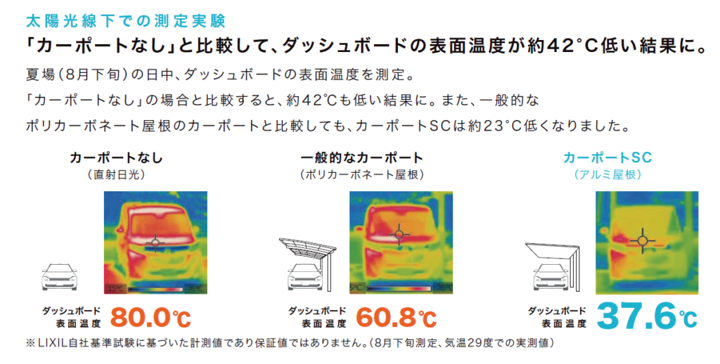 実際の測定データでも、ダッシュボードの温度が一般的なカーポートに比べて約42度も低かったという結果が出ています。