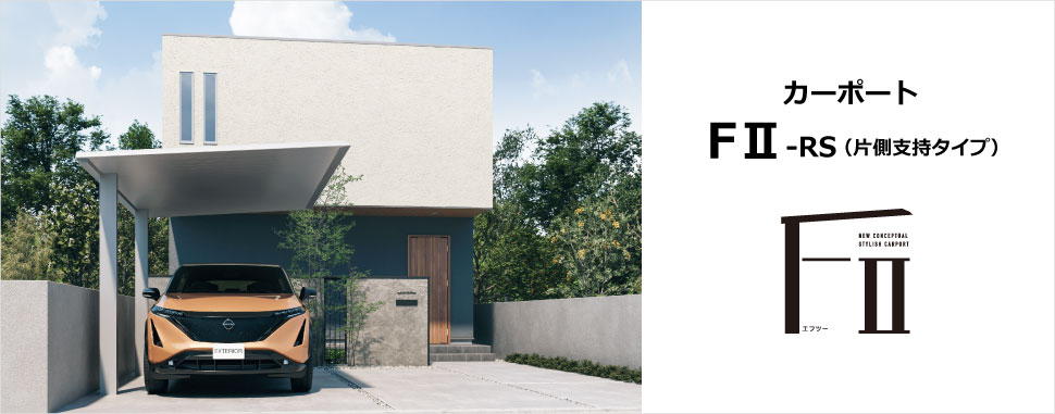 三協アルミの「FⅡ(エフツー)」は、梁と屋根を一体化させた新構造が特徴的なアルミカーポートです。