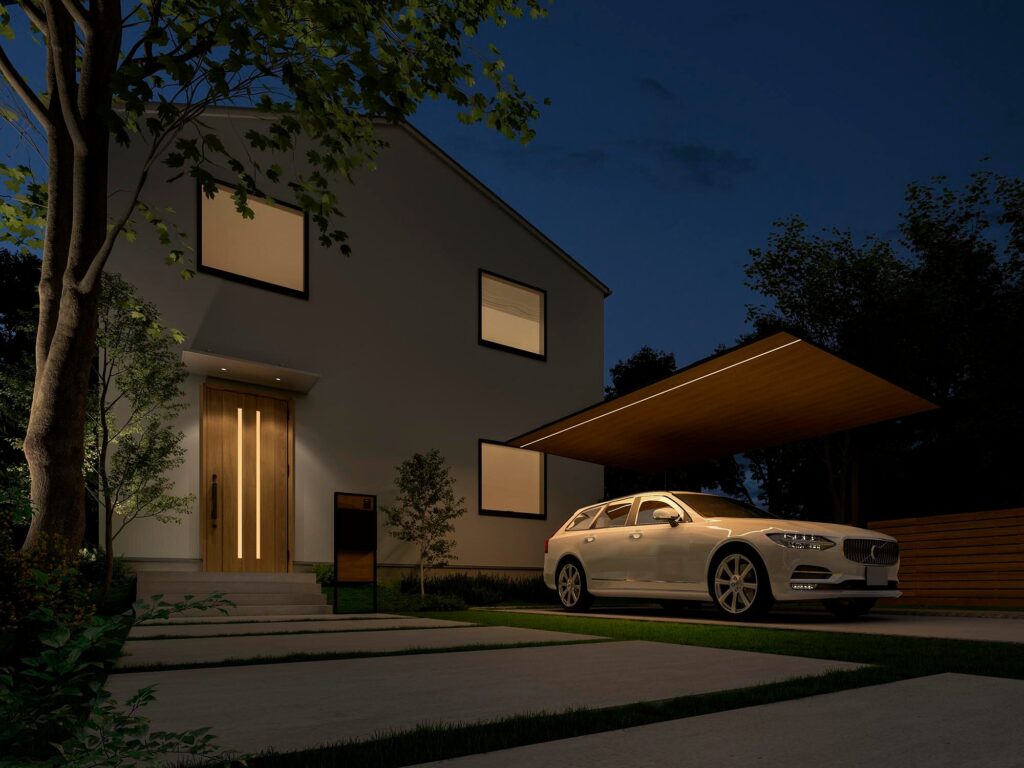 玄関前のカーポートを、夜間でもおしゃれな空間に演出する照明計画についてご紹介します。