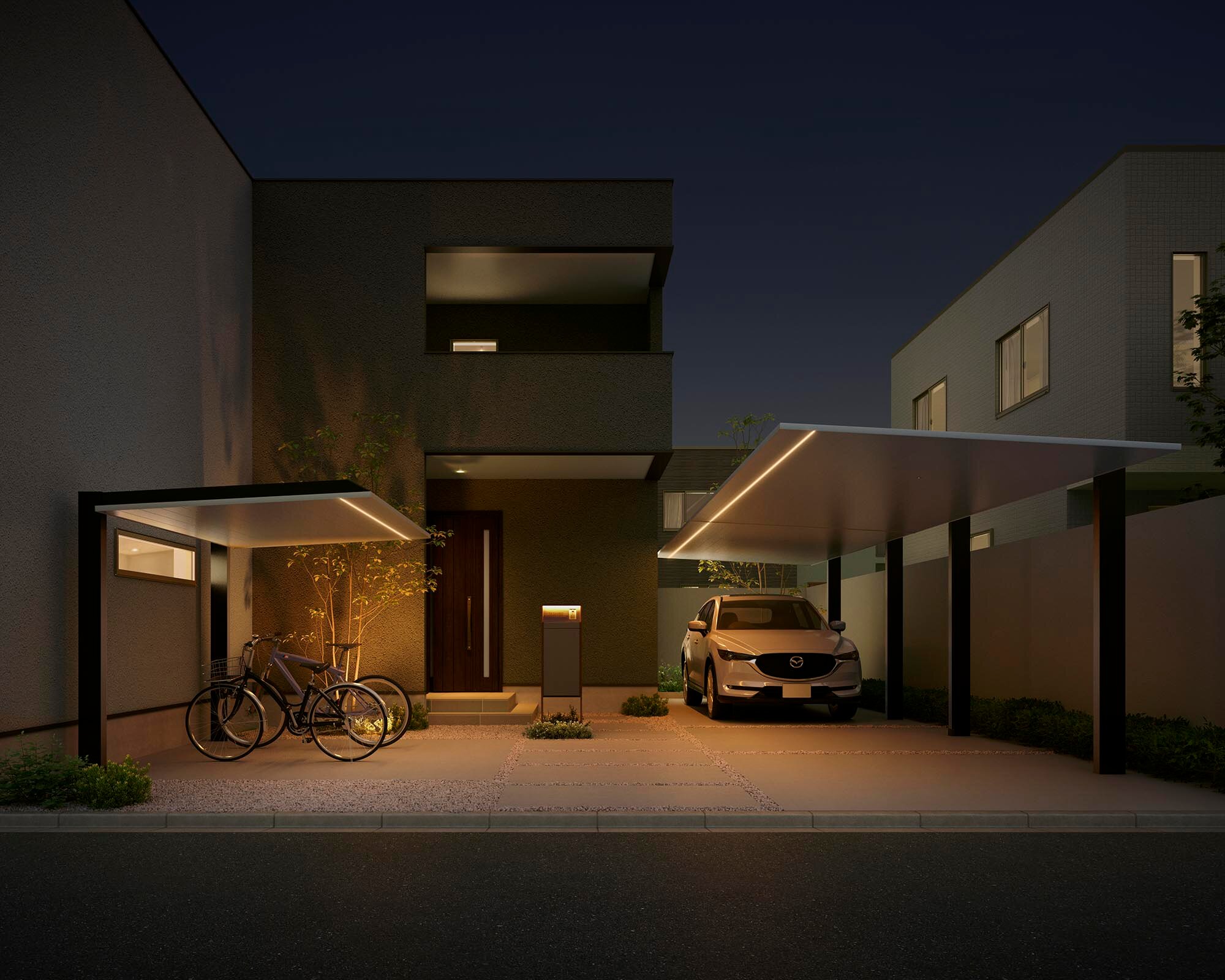 一般的なカーポートにある雨樋やボルトといった要素が巧みに隠されており、まさに「ノイズレスデザイン」。この徹底的に無駄を削ぎ落としたミニマルな美しさは、モダンな住宅と見事に調和し、まるで最初からそこにあったかのような一体感を生み出します。