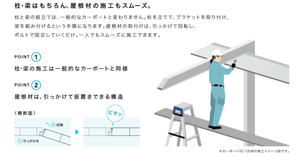 このカーポートは、柱側から屋根の先端(屋根先)に向かって、屋根パネルを一枚一枚、順番に取り付けていきます。そして、最後の屋根パネルを固定する作業は、職人が屋根の先端側から屋根の上に体を乗り出すような体勢で、上からネジを締めなければならないのです。