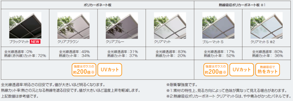 でも、できるだけ屋根の下は明るくしたい!というご希望がある場合、どうするかですが、明るさがほしいということで、まずは光を通す屋根材のポリカーボネートが選択肢に挙がります。