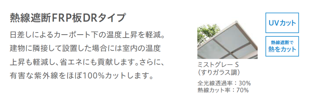 カーポートの屋根材は「熱線カット優先だが、明るさもほしい」というご要望にはこの屋根材がおすすめです。