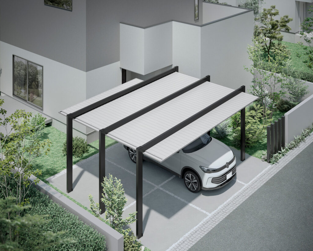 3000は構造上、2台用だと6本柱(片側3本ずつ)になります。これはアルミという素材の特性と、フラットな屋根形状による制約です。
